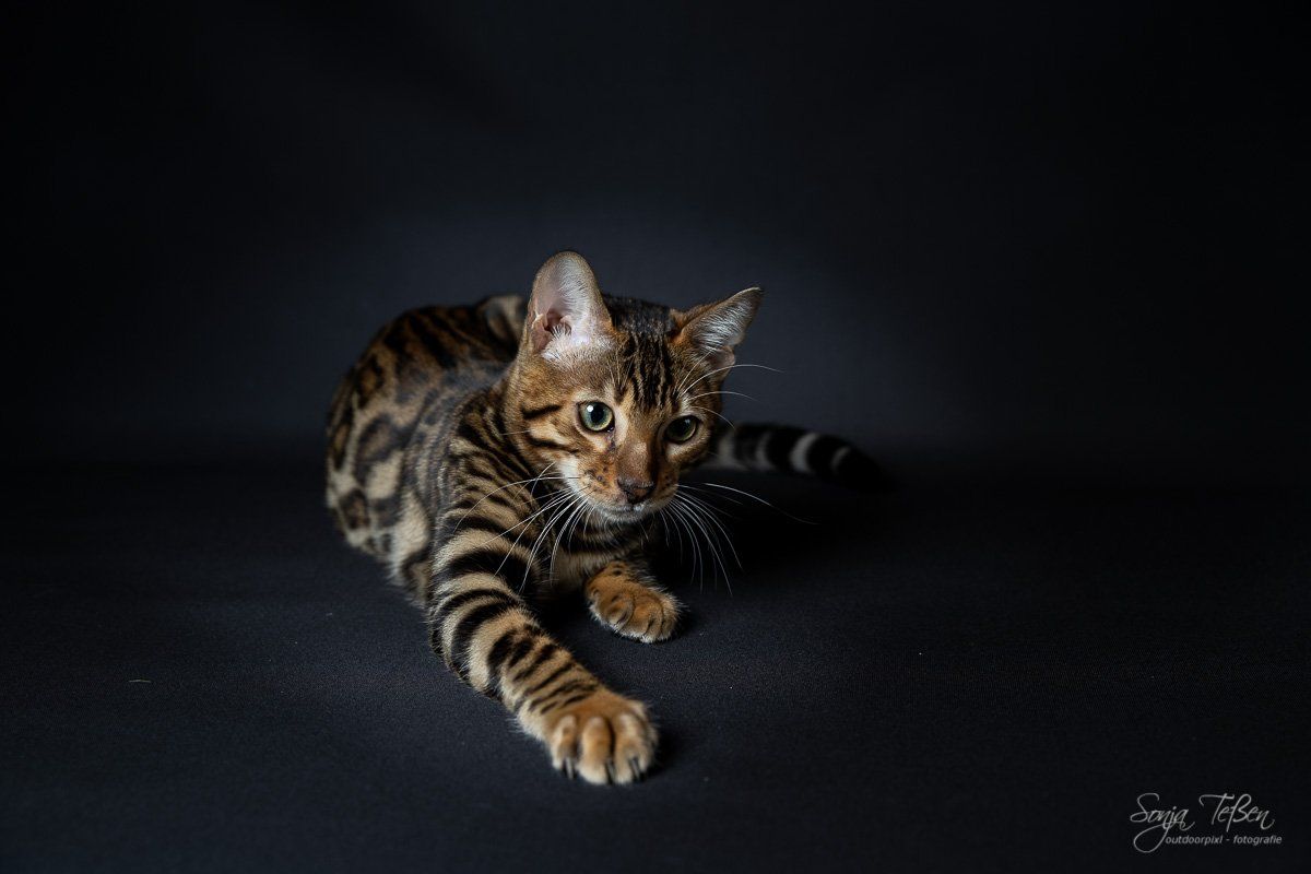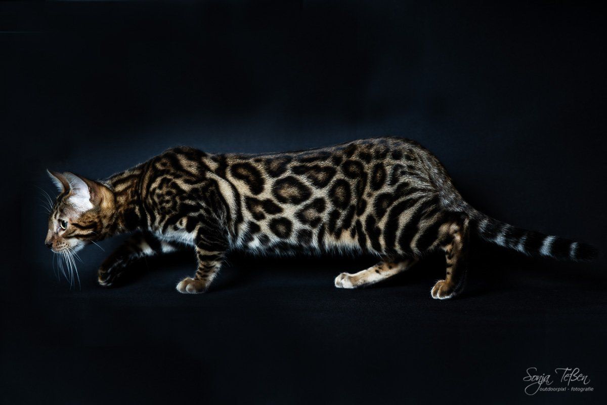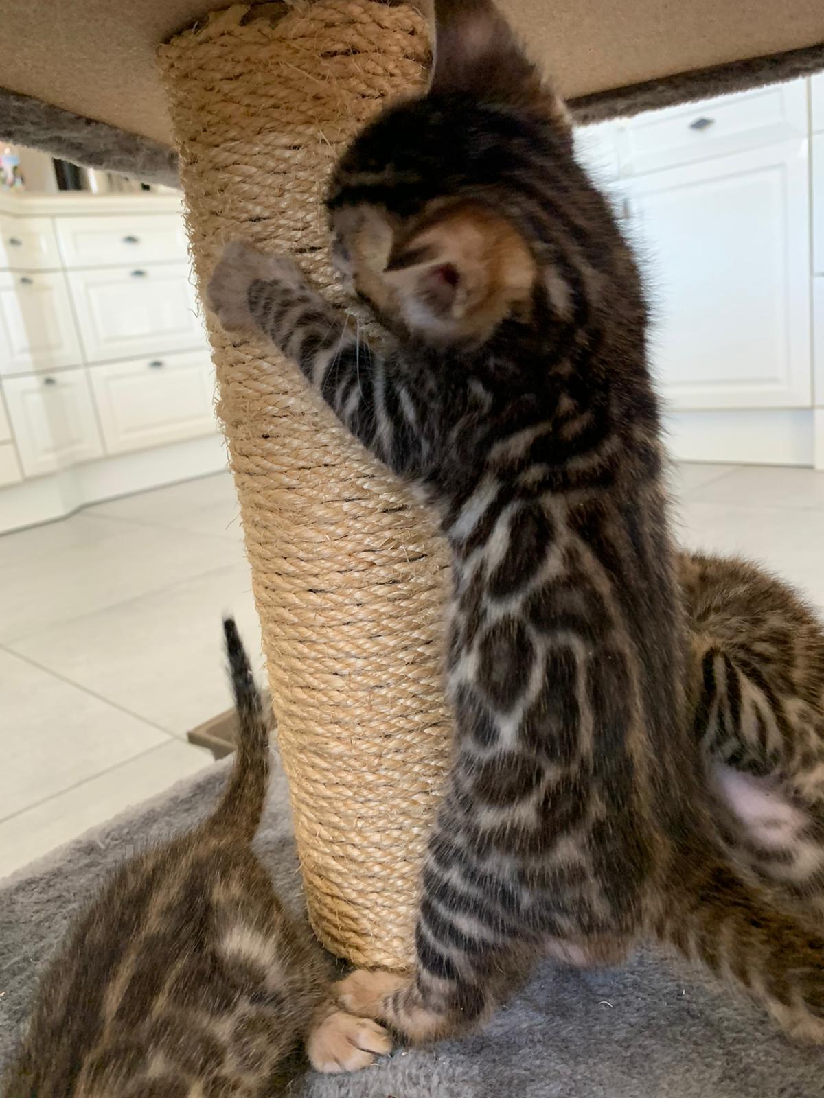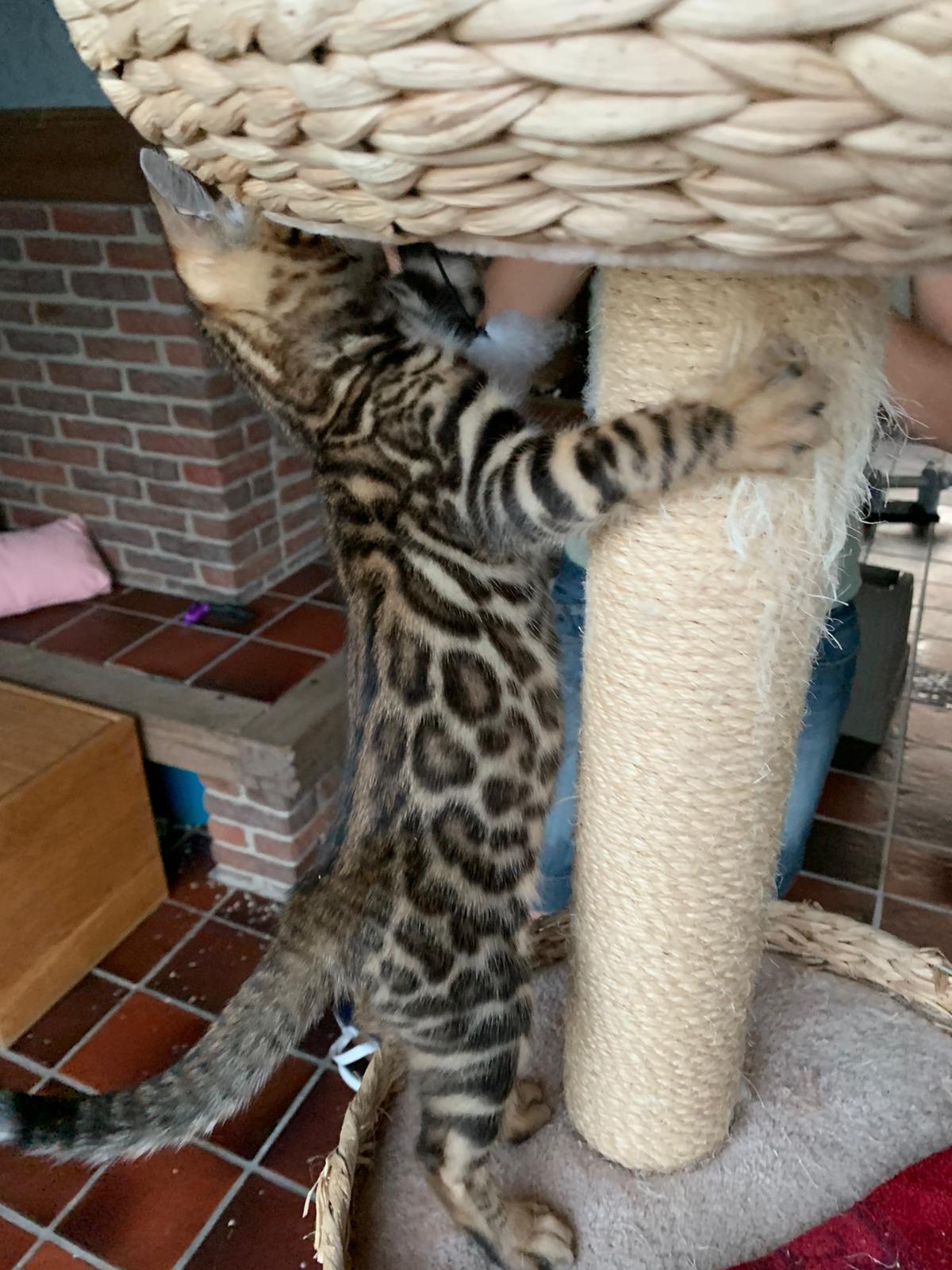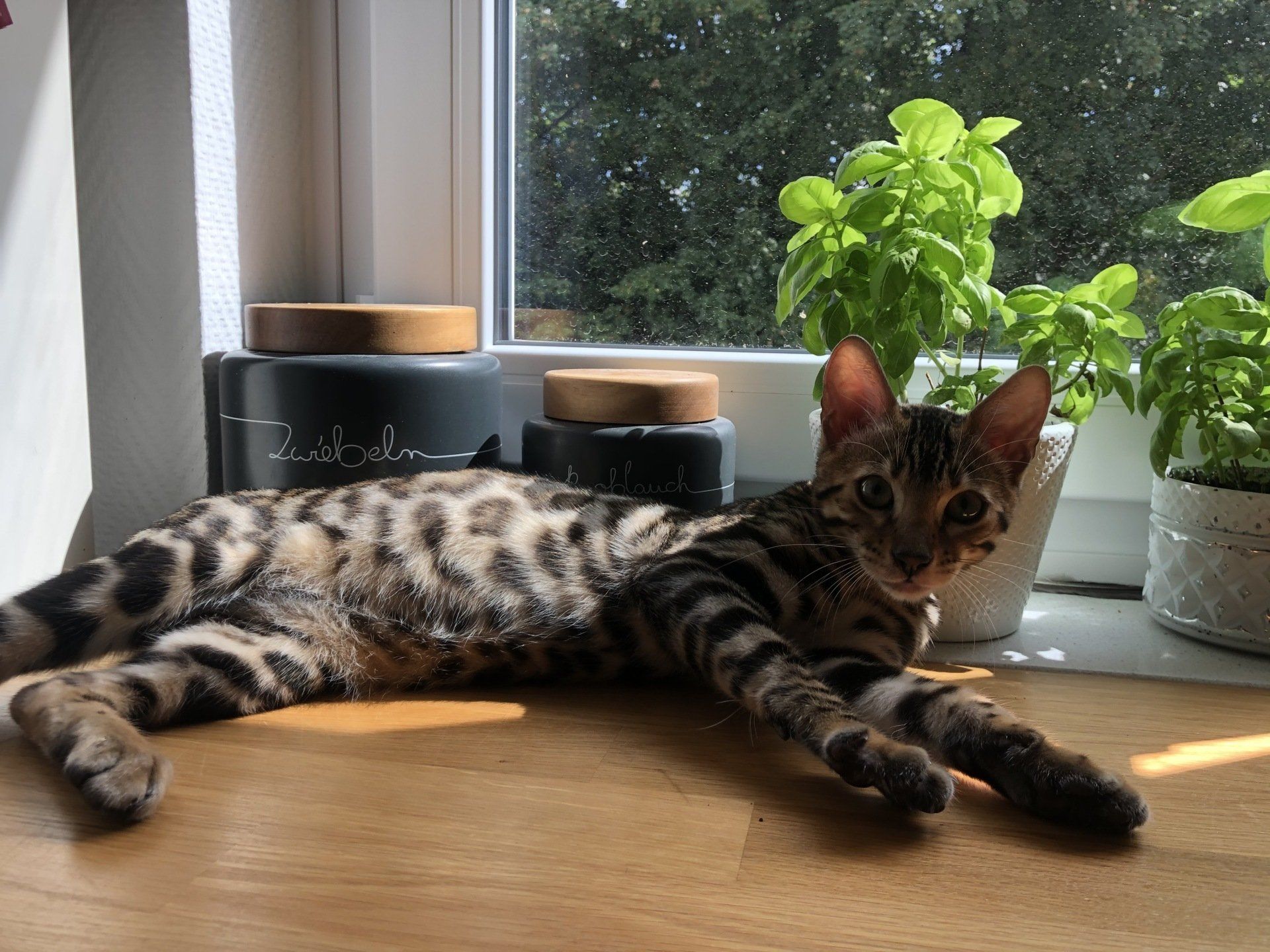 Er ist ein sehr ruhiger und gemütlicher Bengale, aber mit seinen Mädels tobt er gerne durchs Haus.